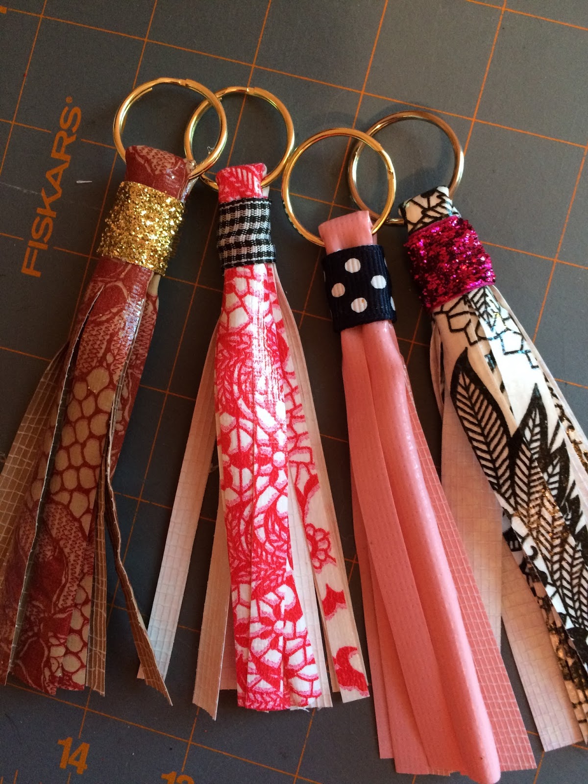 I'm sure many of you have seen tassels popping up on everything from purses to necklaces to home decor, so I thought I'd share with you how I made some using scraps of oil cloth. They look really cute hanging from a lanyard, backpack or purse!The last photo below shows how I customized the keychains for my oldest daughter's dance team motivation gifts for their first competition last weekend. I made each one in the team's colors, then after covering the rubber band with gold ribbon, I added some Dollar Store rhinestone trim. The tags I made on my Cricut Explore out of plain white heavy card stock (110 lb.). I'm kind of wishing I had laminated them because the girls loved them so much. If you look closely, I used Cricut's Design Space software to create a lock that has the opening and the end of a key in the shape of a Liberty Bell. Her dance team's name is the Liberty Belles... so, you can imagine I felt pretty clever right about then! I had the Cricut write the words on the shapes as well, the key says "YOU ARE THE KEY" and the lock says "SUCCESS."